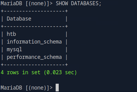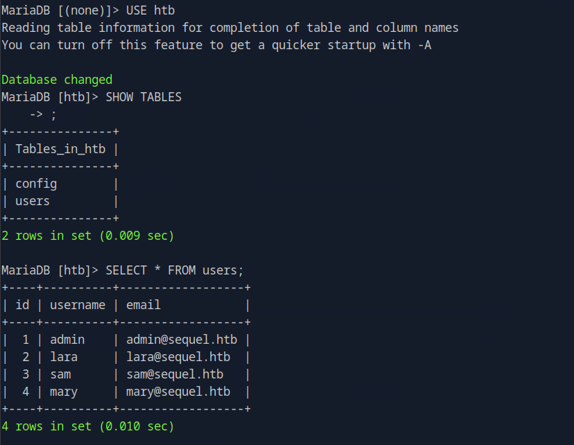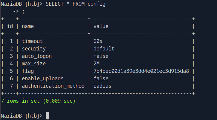 Moved into the database using “”USE htb””. Then listed the tables using “”SHOW TABLES;””. You can see I missed the ; at the end but it went to the next line and let me use it. I listed everything found in users. As there wasn’t any use to move forward with the back with that information I checked out the table config and we found it.