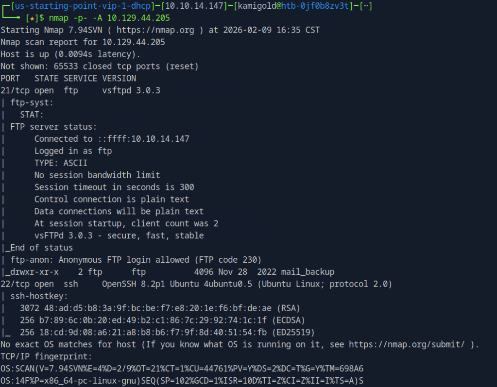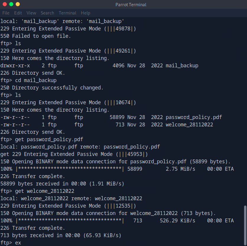 Connected to the ftp server using ftp 10.129.44.205 and using the anonymous:anonymous credentials. I tried downloading the file using get but it failed. Realised mail_backup is a directory. Cd into that directory then downloaded those files.