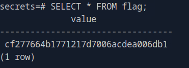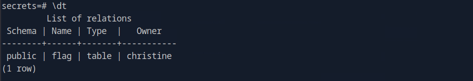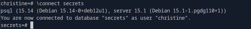 Secrets looks interesting. Using \connect, we can take a look at that.