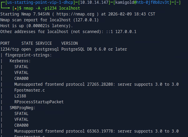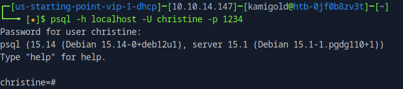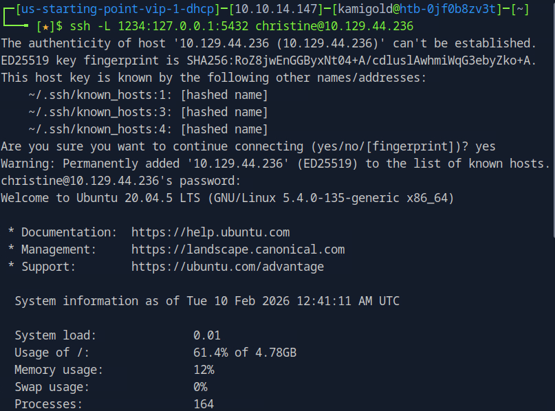 New machine IP 10.129.44.236. I had to rely heavy on the write up and https://www.youtube.com/watch?v=HxWtXhL1mVU here to open port locally as I only have very surface level understanding of pivoting. I’ll study this heavily further in the future. My brain was thinking I had to run a command from the victim itself to open a port. Instead, this command essentially opens all traffic from 1234 to forward to the port we want 5432 when ran from our machine.