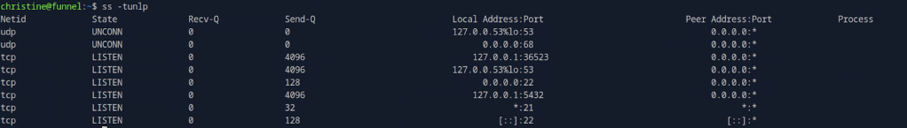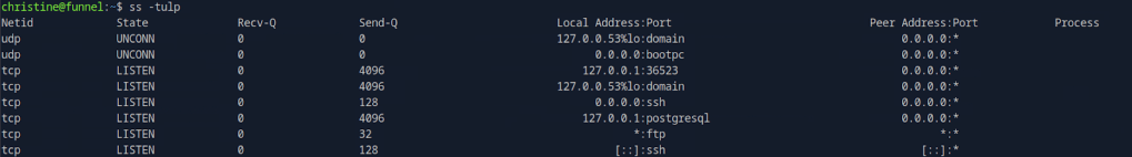 I didn’t have anything else in my notes that would help here but I also don’t exactly know what all of the switches mean in ss, so I did research. https://www.geeksforgeeks.org/linux-unix/ss-command-in-linux/