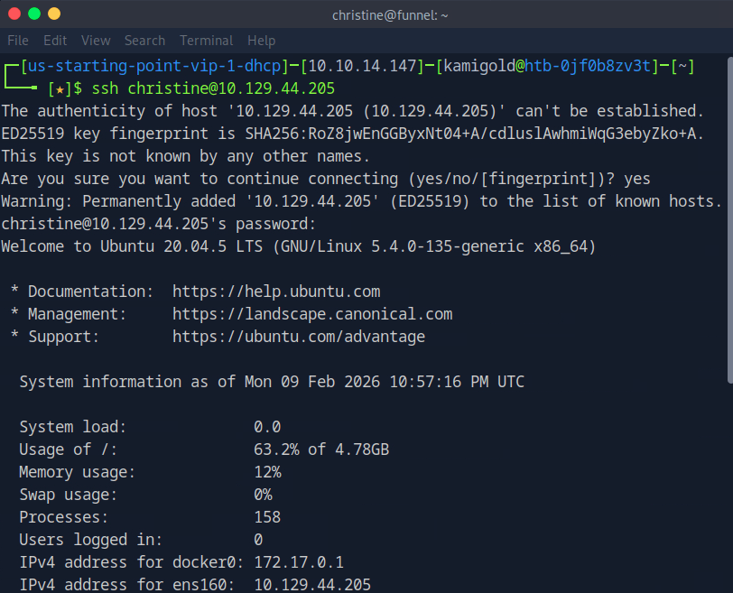 Since we saw ssh was open earlier with the nmap scan, and that would give us more access to the victim if it works, I tested the credentials there. If this list was longer I’d use hydra to password spray it that way but since there are only 5 users I just did it manually. It turns out to be christine.