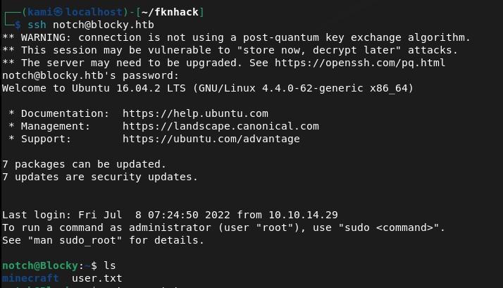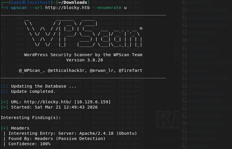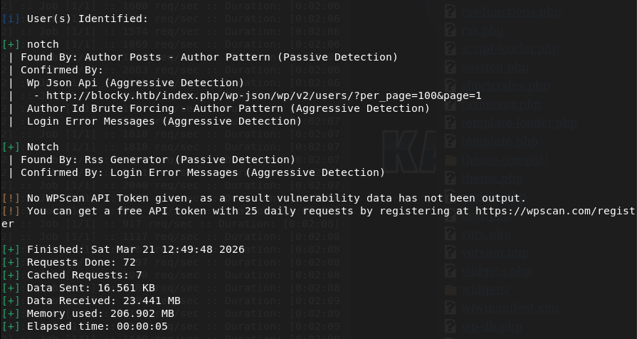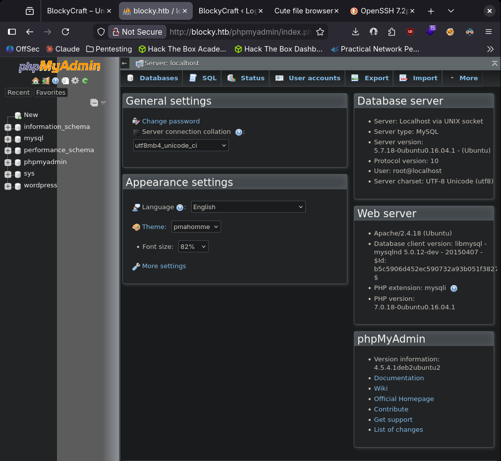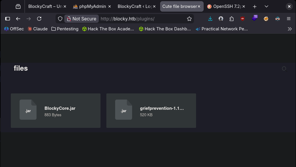 Checked port 22. The version of that does have a vulnerability that I seen in the past but hackthebox machines usually patch it. I will just keep this in the back of my head for now. The last port also looks like a minecraft server. I doubt thats the path we need to take. At this point ffuf finished. I’m not going to bother showing screenshots. I’m annoyed about scrolling through errors so for the future I’m going to start using feroxbuster again (I know I can filter them out but I’d really just prefer to drop one line command off the rip and not do testing first, also feroxbuster is recursive). I poked through the directories. Things to take away is phpmyadmin page, there’s wordpress and an interesting /plugins directory.