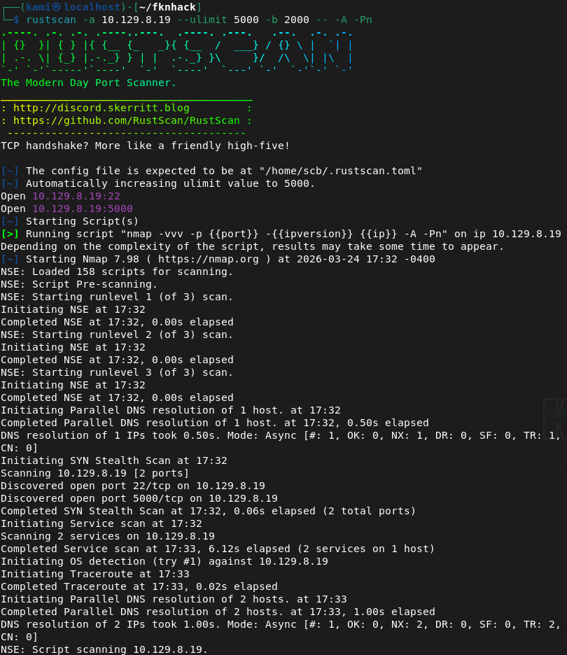 rustscan -a 10.129.8.19 --ulimit 5000 -b 2000 -- -A -Pn