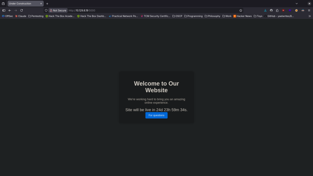 Nothing interesting in robots.txt or source code. The For questions buttons brings us to a new page.