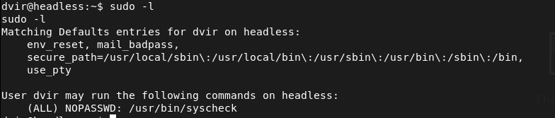 Privilege escalation — always use absolute paths in scripts that run with elevated privileges. Audit sudo rules regularly and apply least privilege — dvir had no business running a system health script as root.