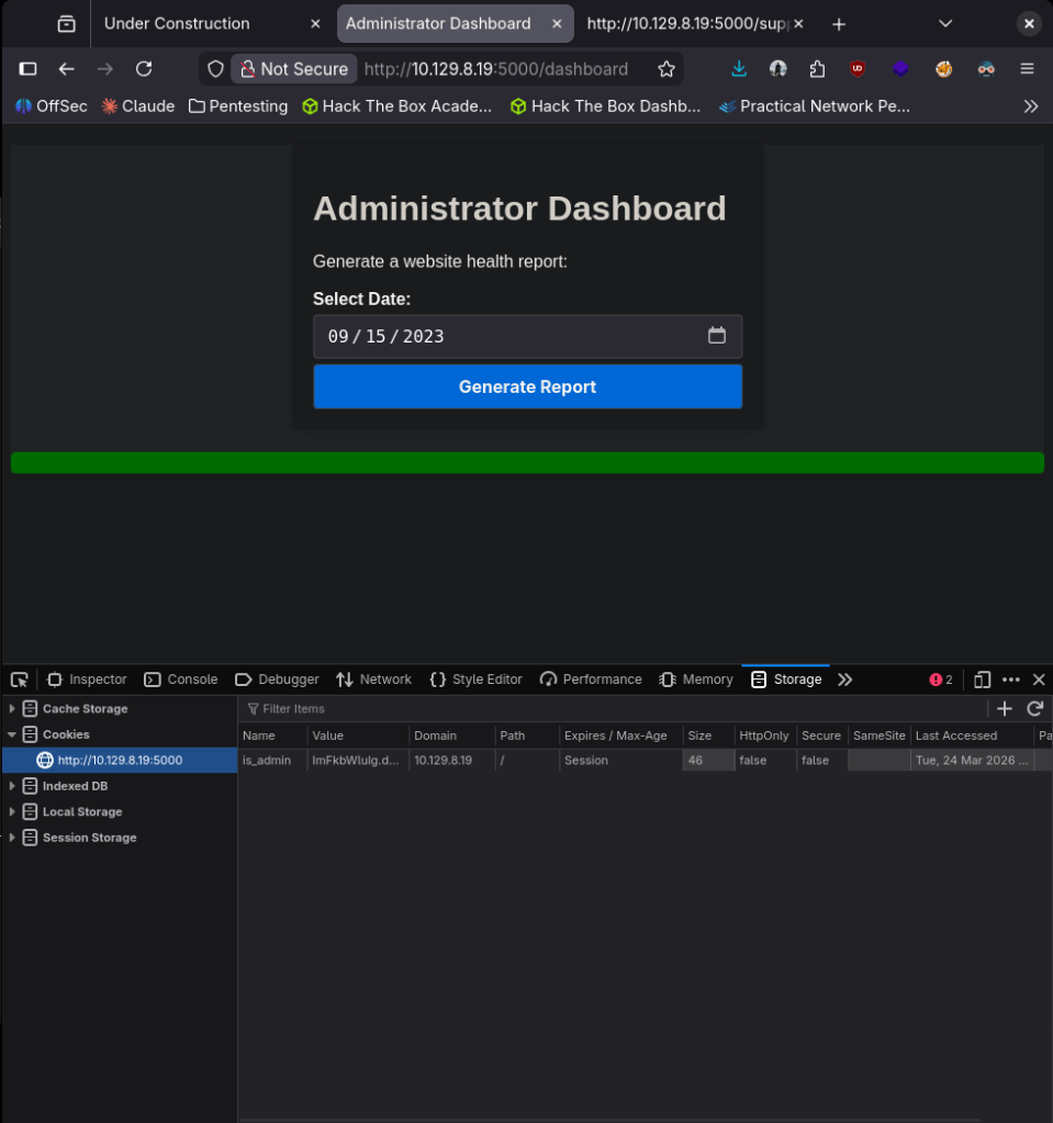 I added it to my cookie value in Storage Dev tools, refreshed and we get access to the Administrator Dashboard.