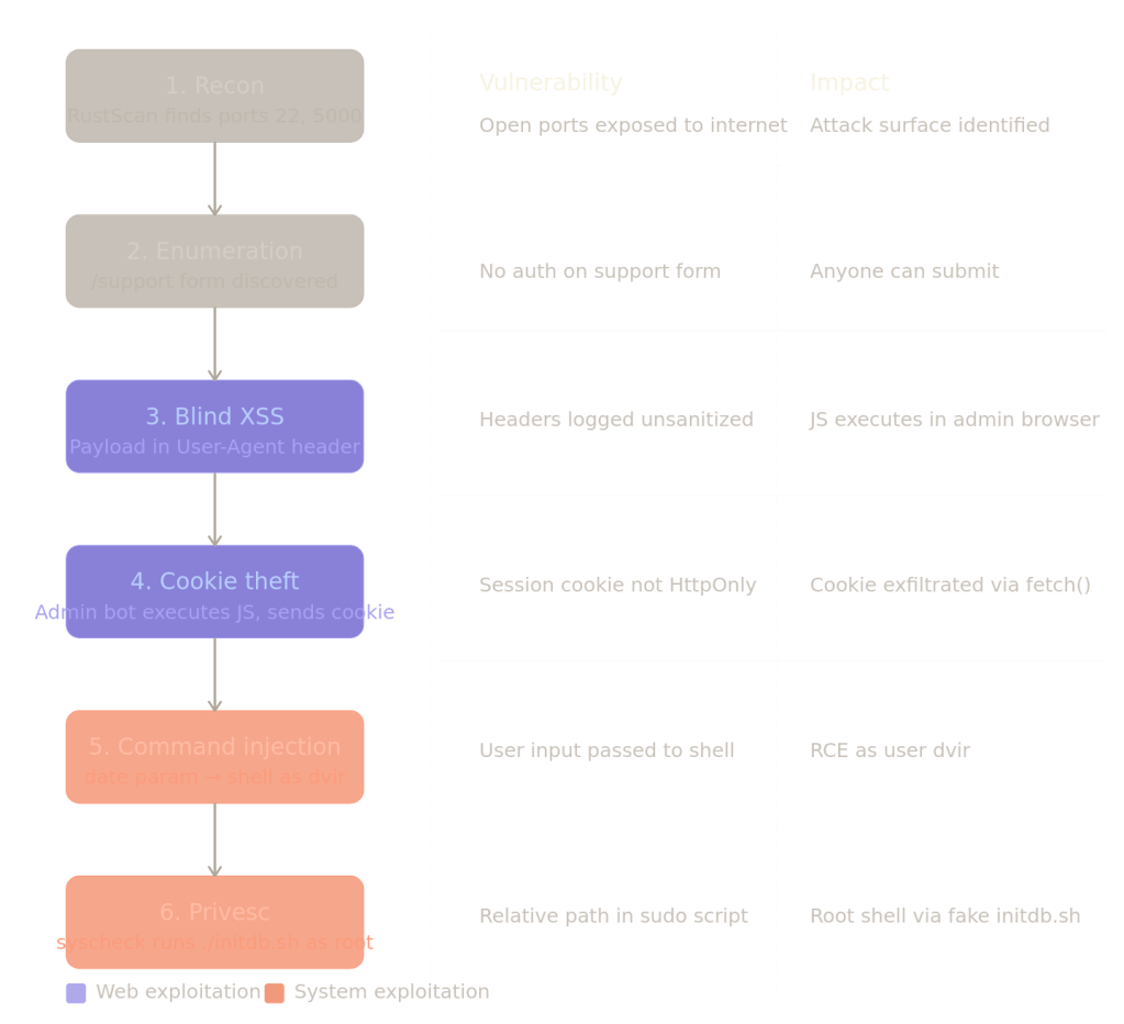 Session cookies without HttpOnly are trivially stealable. One flag would have broken the entire chain at step 4.
