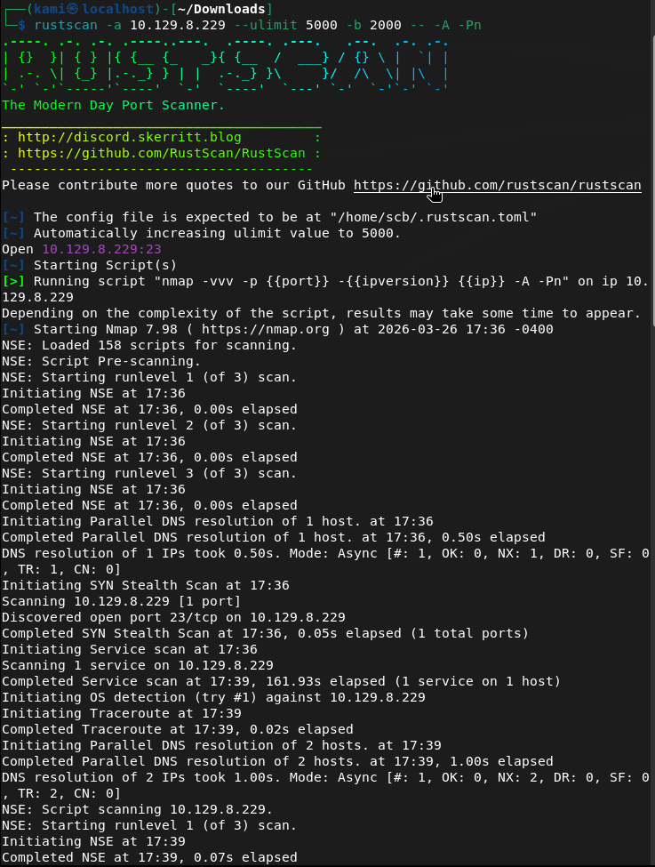 rustscan -a 10.129.8.229 –ulimit 5000 -b 2000 — -A -Pn