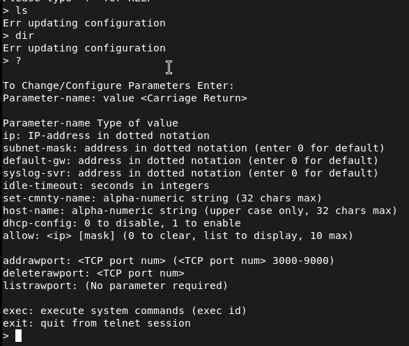 Initially I tried listing any files but I kept getting a ‘Err updating configuration’. I ran ‘?’ and it shows we can exec commands.
