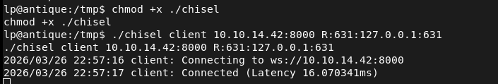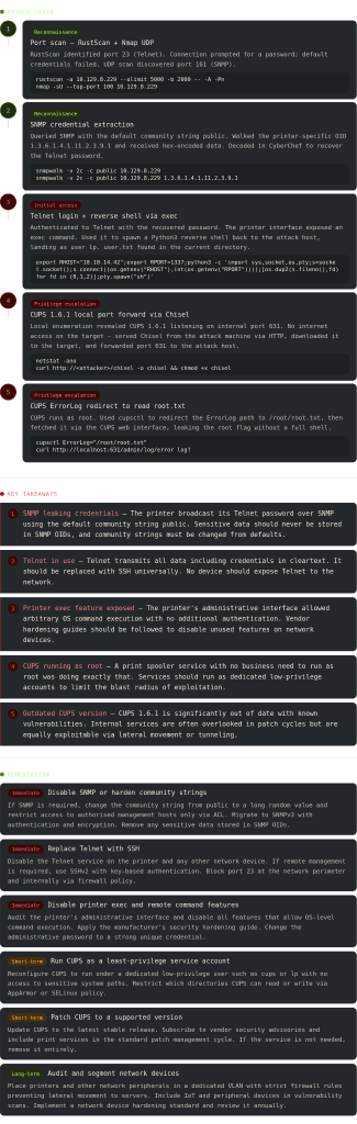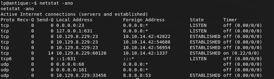 Overview: Antique is an easy Linux machine featuring a network printer disclosing credentials through SNMP string which allows logging into telnet service. Foothold can be obtained by exploiting a feature in printer. CUPS administration service running locally. This service can be exploited further to gain root access on the server.