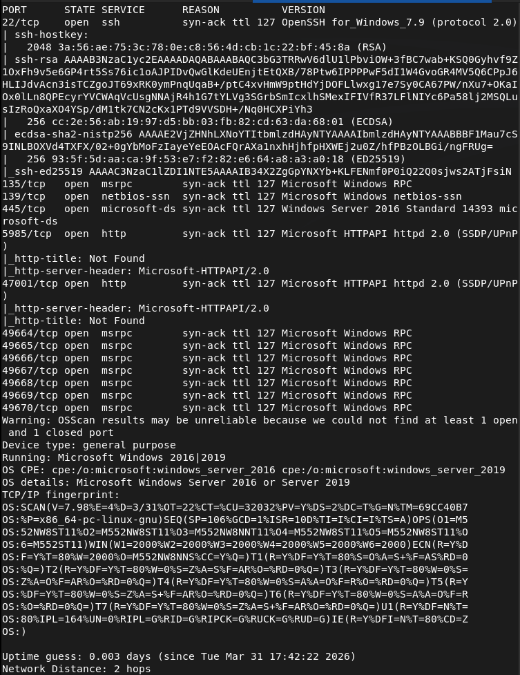 1 – Reconnaissance Ran RustScan and identified ports 22 (SSH), 445 (SMB), and 135 (MSRPC). SMB looked like the most promising starting point.