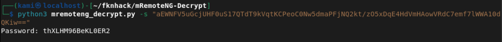 python3 mremoteng_decrypt.py -s "aEWNFV5uGcjUHF0uS17QTdT9kVqtKCPeoC0Nw5dmaPFjNQ2kt/zO5xDqE4HdVmHAowVRdC7emf7lWWA10dQKiw=="