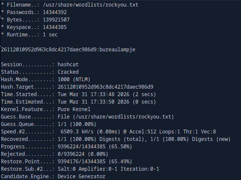 hashcat -m 1000 26112010952d963c8dc4217daec986d9 /usr/share/wordlists/rockyou.txt