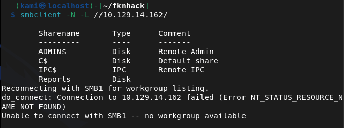 rustscan -a 10.129.14.162 –ulimit 5000 -b 2000 — -A -Pn smbclient -N -L //10.129.14.162/