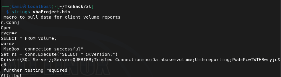 2 – SMB enumeration and macro extraction Connected to the Reports share anonymously and downloaded Currency Volume Report.xlsm. Opened it in LibreOffice and found no visible content but macros were present. Unzipped the file and ran strings against the VBA project binary to extract embedded credentials.