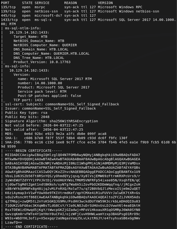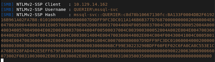 Overview: Querier is a medium difficulty Windows box which has an Excel spreadsheet in a world-readable file share. The spreadsheet has macros, which connect to MSSQL server running on the box. The SQL server can be used to request a file through which NetNTLMv2 hashes can be leaked and cracked to recover the plaintext password. After logging in, PowerUp can be used to find Administrator credentials in a locally cached group policy file.