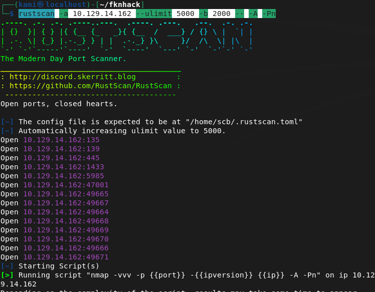rustscan -a 10.129.14.162 --ulimit 5000 -b 2000 -- -A -Pn