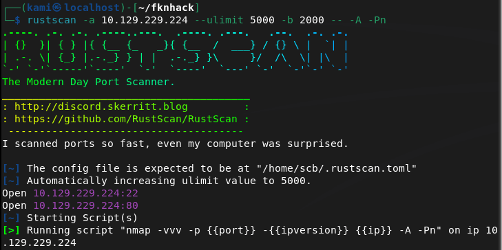 Rustscan -a 10.129.229.224 –ulimit 5000 -b 2000 – -A -Pn