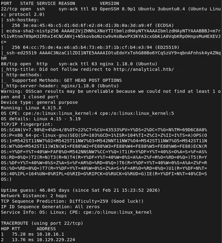 1 – Reconnaissance Ran RustScan and identified ports 22 (SSH) and 80 (HTTP). Added analytical.htb to /etc/hosts and browsed to the website. Clicking the login button redirected to data.analytical.htb which was added to /etc/hosts separately. Found a Metabase login page. Ran feroxbuster and ffuf for directory and subdomain enumeration.