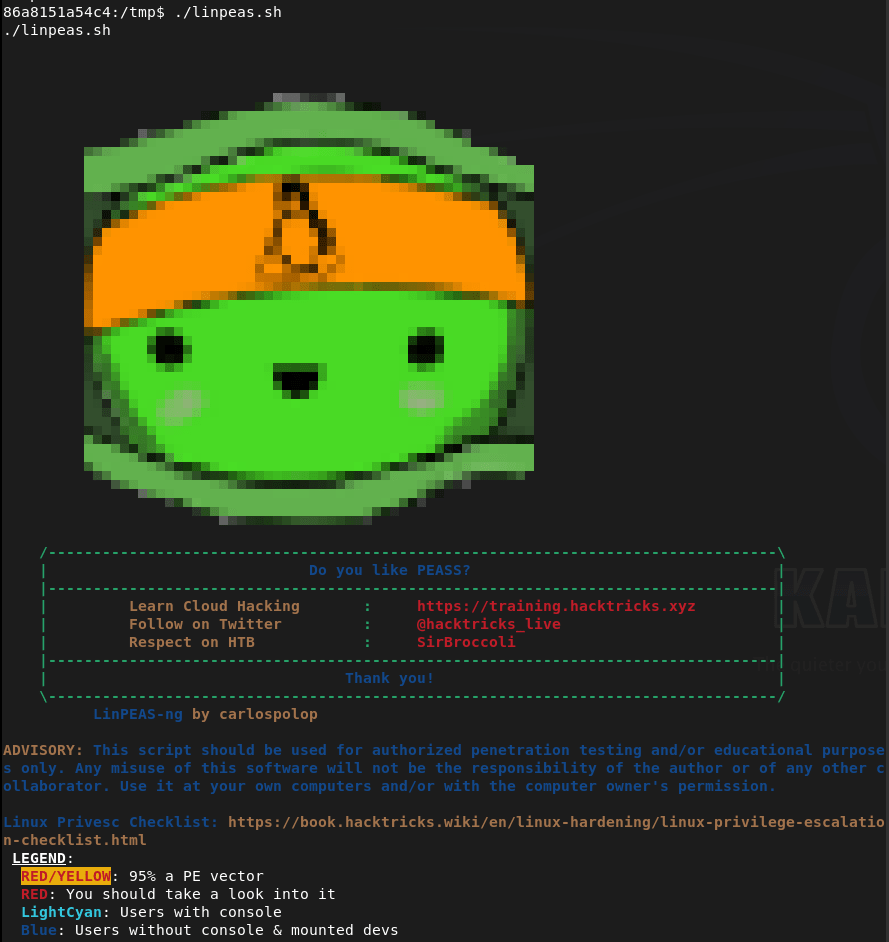 4 – Privilege Escalation – GameOverlay kernel exploit (CVE-2023-2640 / CVE-2023-32629) Ran LinPEAS on the host and identified the kernel version was vulnerable to the GameOverlay exploit affecting Ubuntu kernels. Used the exploit to gain a shell as root and retrieved root.txt.