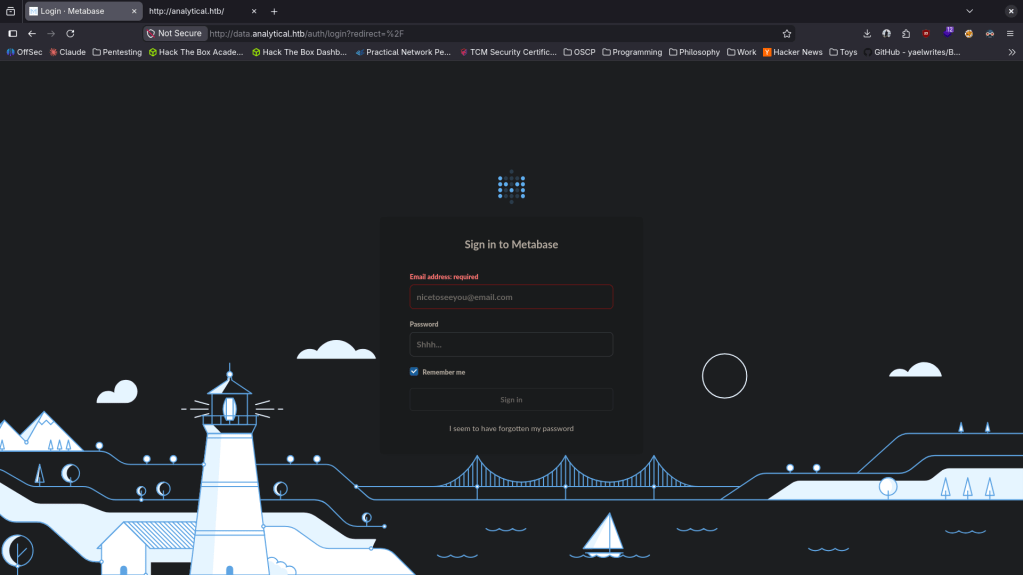 There are a few emails and full names on the page but I’m not exactly confident that these are useful at the moment. When I click login it brings me to a data.analytical.htb. Added that to /etc/hosts. Looks like we get a Metabase login.
