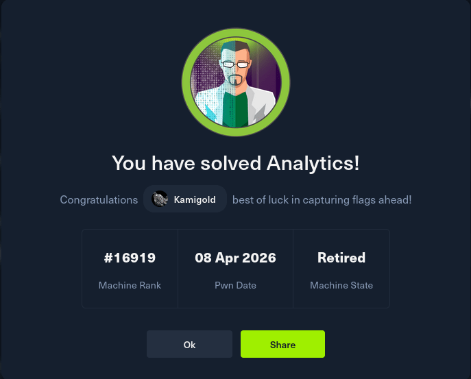 Link: https://app.hackthebox.com/machines/Analytics?tab=machine_info&sort_by=created_at&sort_type=desc
