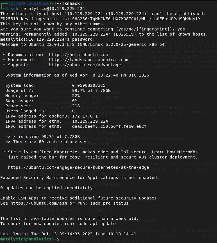 3 – Container escape via environment variables Ran LinPEAS inside the container and found credentials stored in environment variables. Used them to SSH directly into the host as the metalytics user and retrieved user.txt.
