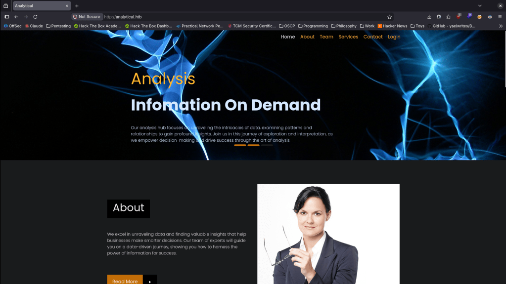 Checked out the http port. Had to add analytical.htb to /etc/hosts. We get a website.