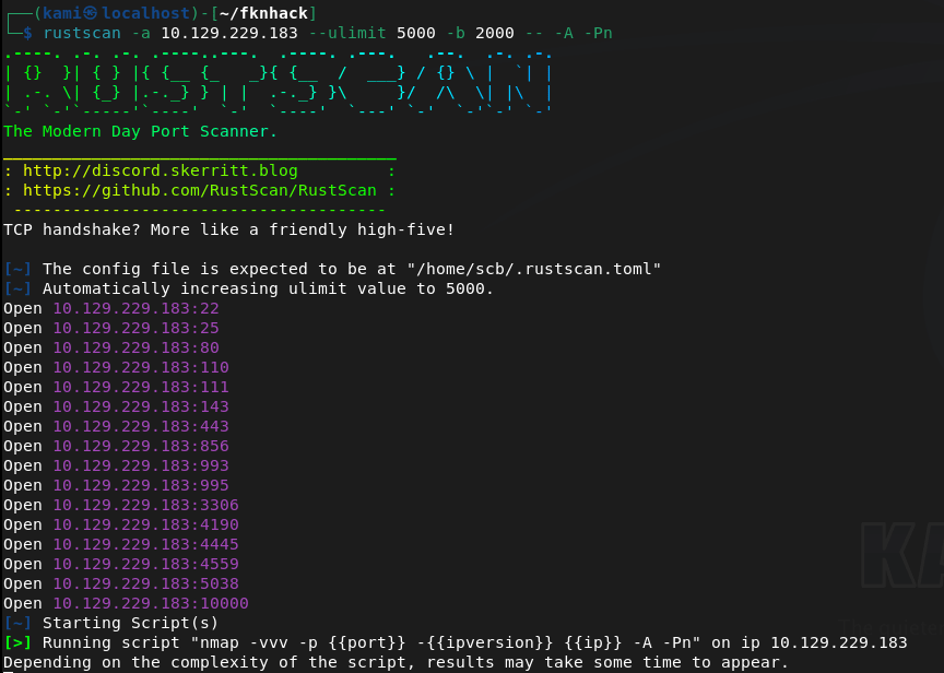 rustscan -a 10.129.229.183 –ulimit 5000 -b 2000 — -A -Pn