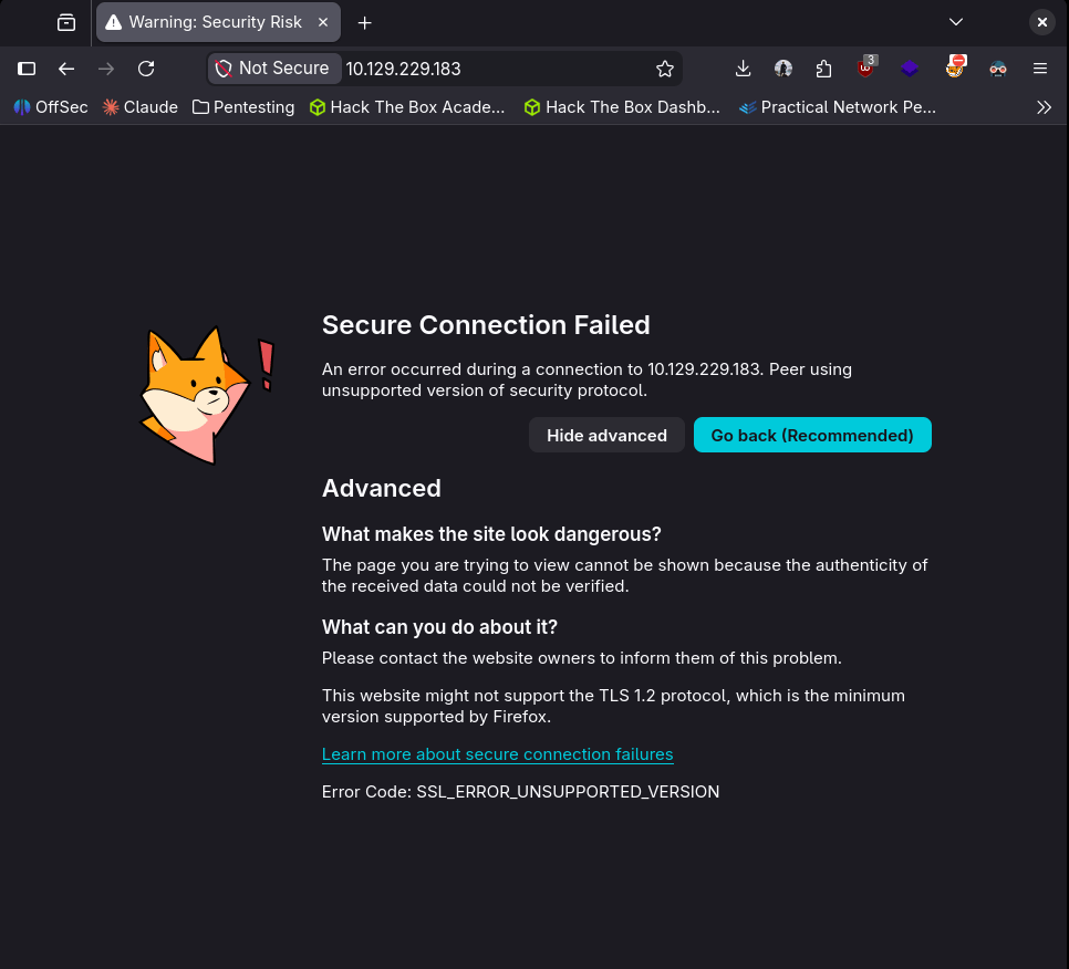 As I have a bigger picture and nothing seemed overly alarming just yet. Let’s go back to port 443. Enabling my browser to bypass the security error by allowing TLS 1.0 we get a log in page.
