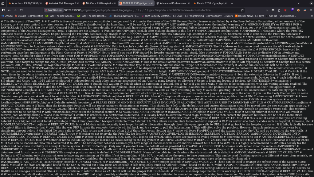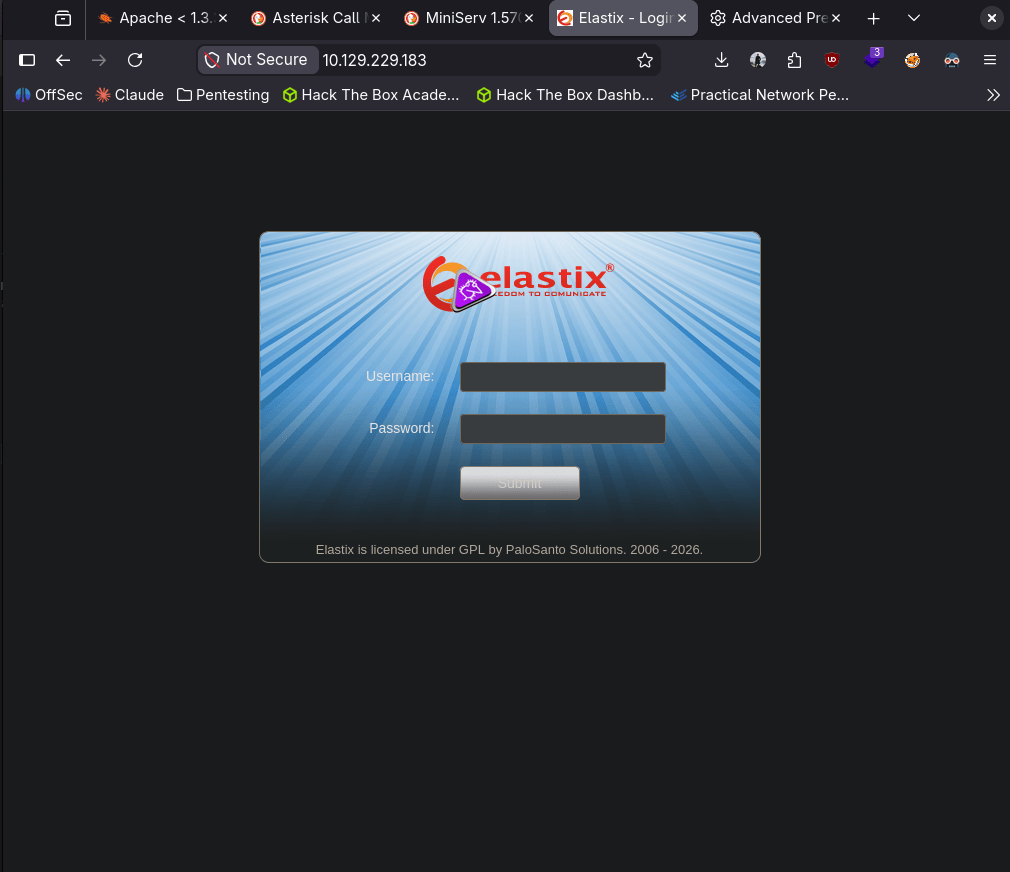3 – Initial Access – Elastix LFI credential disclosure Identified the Elastix version through the web interface. Found a public LFI exploit for this version on Exploit-DB (EDB-37637). Used the LFI path to read sensitive system files and recovered plaintext credentials including admin:jEhdIekWmdjE. Confirmed the credentials worked on the Elastix dashboard.