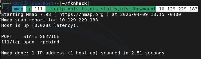nmap -p 111 –script=nfs-ls,nfs-statfs,nfs-showmount 10.129.229.183
