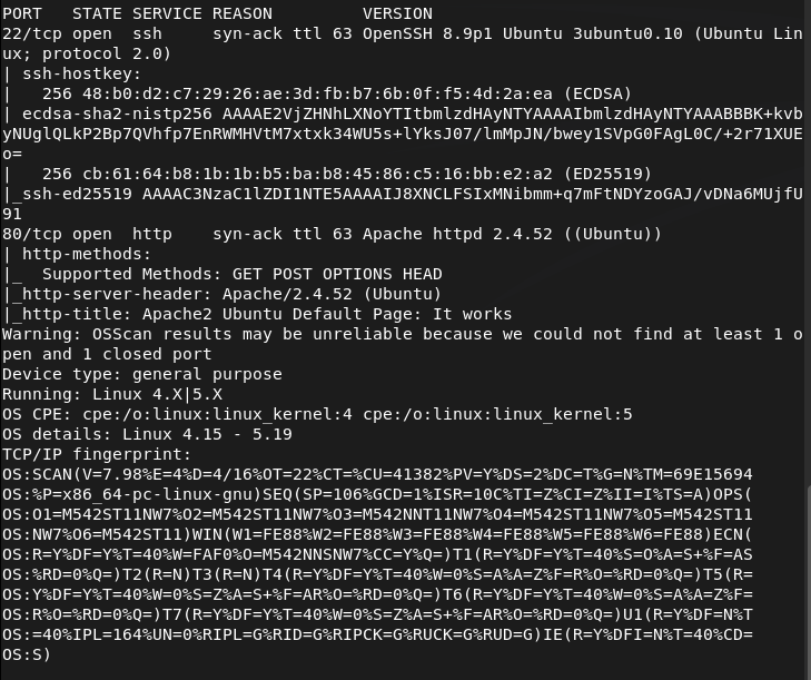 1 – Reconnaissance Ran RustScan and identified ports 22 (SSH) and 80 (HTTP). Browsed to the web server and found a default Apache Ubuntu page. Feroxbuster and ffuf found nothing useful. Manually checked robots.txt and source code with no findings. Researched the Apache version and found CVE-2022-23943 but it was a DoS vulnerability and not a viable path. Stepped back and scanned UDP ports.