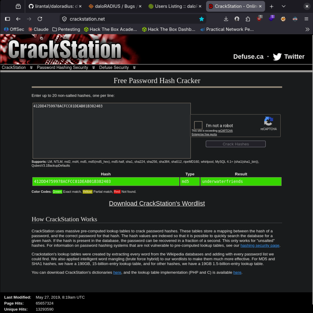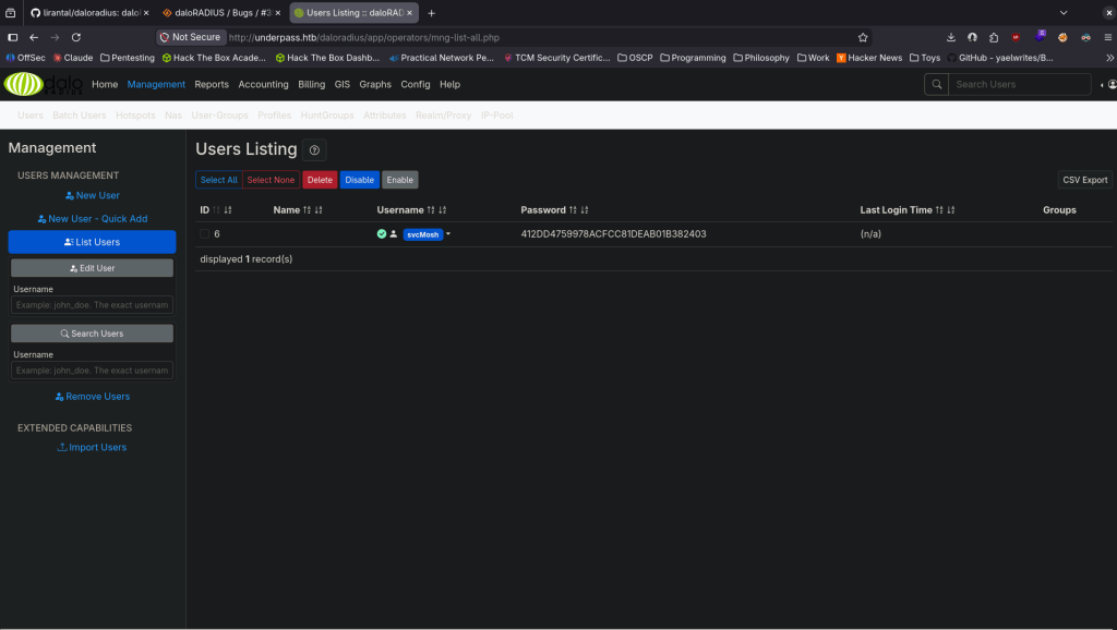 3 – Hash extraction and cracking Explored the daloradius operators panel and found a user account for svcMosh with a stored password hash. Identified the hash as MD5 and cracked it using CrackStation.