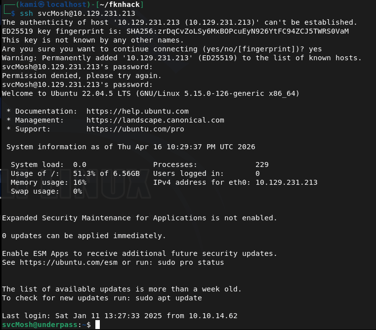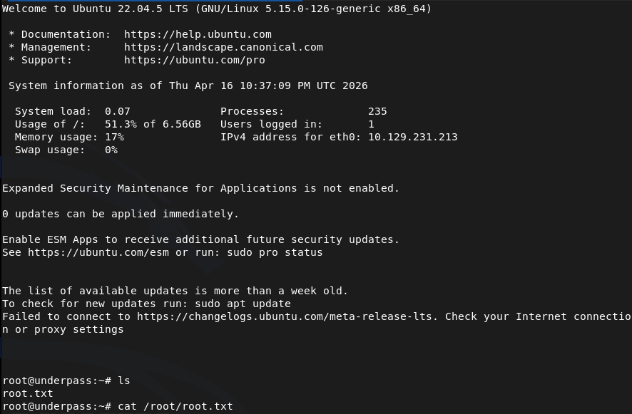 Overview: Underpass is an Easy Linux machine starting with a default Apache Ubuntu page. This leads the attacker to enumerate the machine’s UDP ports for alternative attack vectors. The attacker can enumerate SNMP and discover that Daloradius is running on the remote machine, and the operators panel can be accessed using the default credentials. Inside the panel, the password hash for the user svcMosh is stored, and it’s crackable. Then, the attacker can log in to the remote machine using SSH with the credentials they have obtained. The user svcMosh is configured to run mosdh-server as root, which allows the attacker to connect to the server from their local machine and interact with the remote machine as the root user.