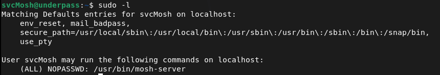 - Sudo rule allowing mosh-server with no restrictions – svcMosh could run mosh-server as root with no restrictions on arguments or ports, which allowed spinning up a root-owned interactive session accessible from any host. Sudo rules for network services must be reviewed for escalation paths and restricted to the minimum required functionality.