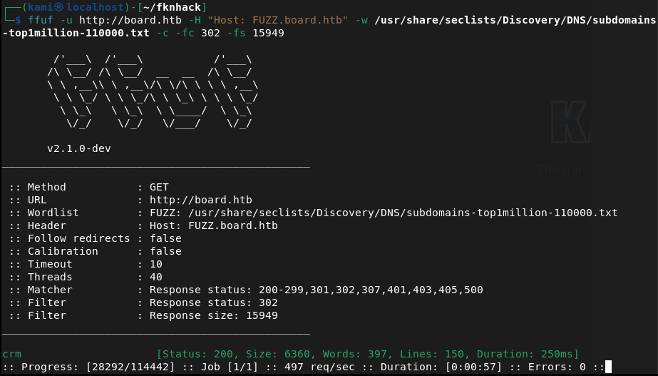 ffuf -u http://board.htb -H “Host: FUZZ.board.htb” -w /usr/share/seclists/Discovery/DNS/subdomains-top1million-110000.txt -c -fc 302 -fs 15949