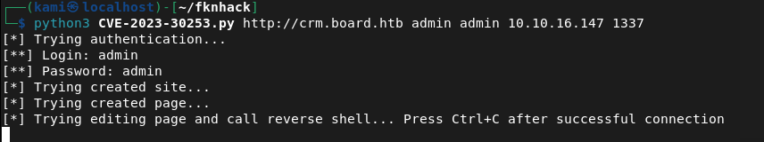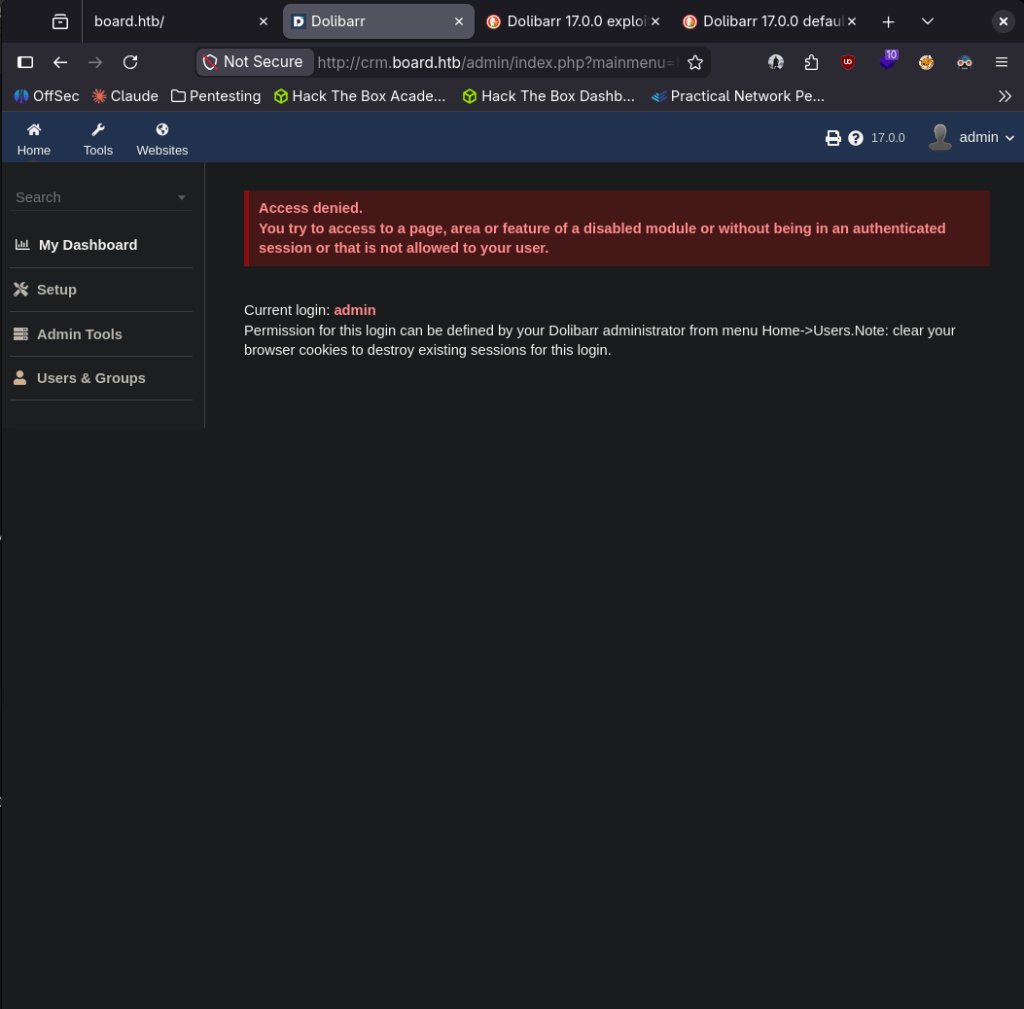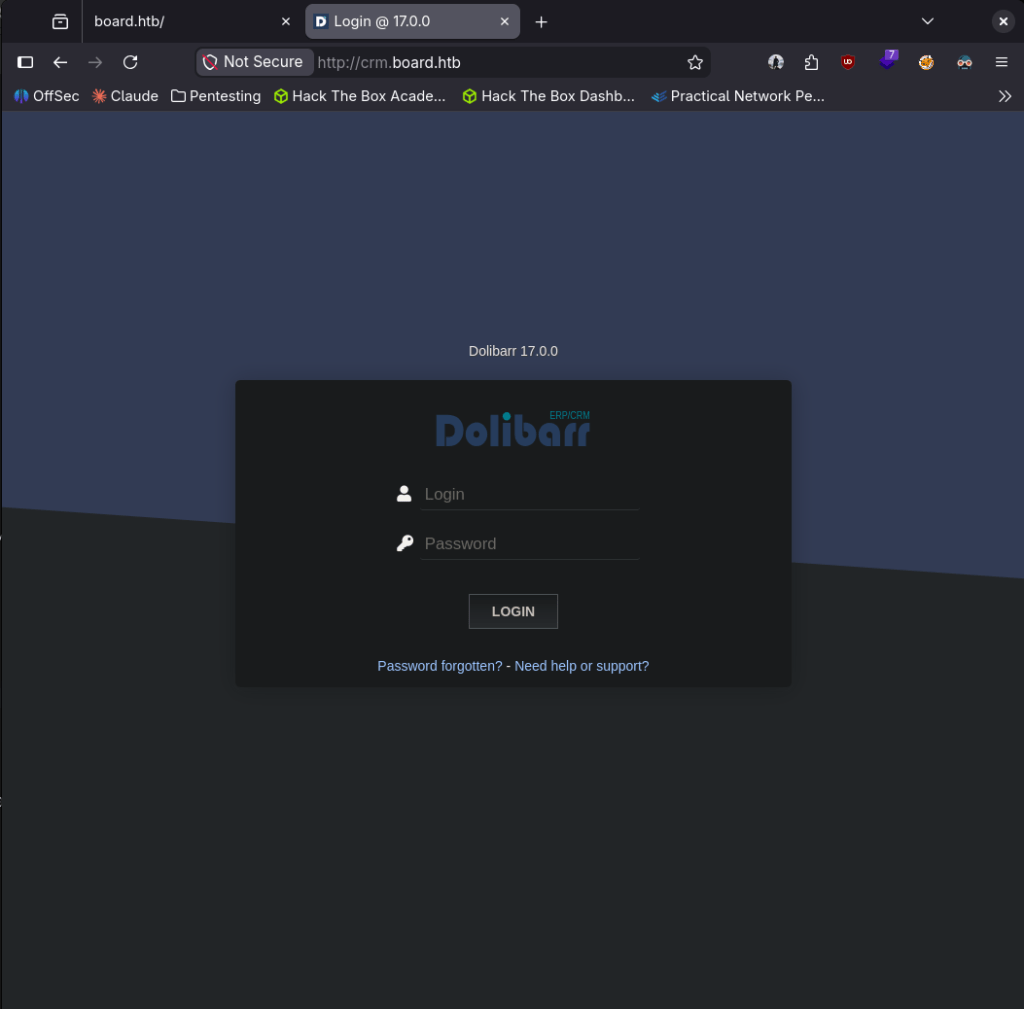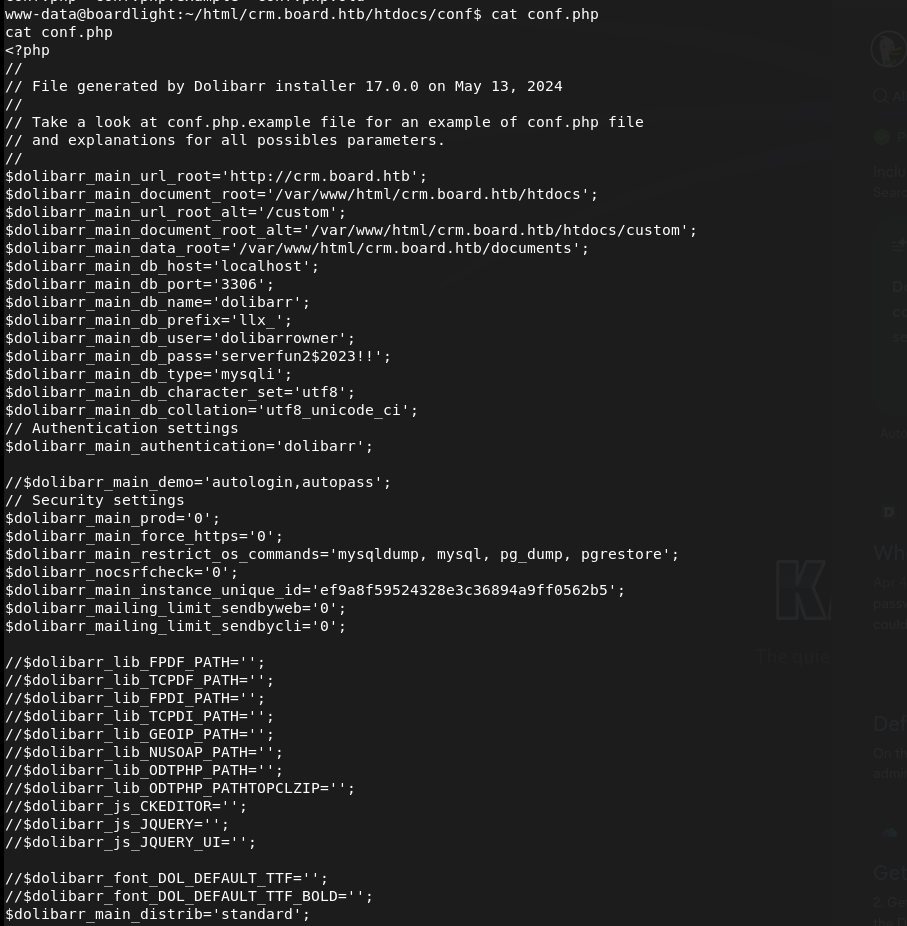 2 – Dolibarr default credentials and RCE – CVE-2023-30253 Browsed to crm.board.htb and found a Dolibarr 17.0.0 login page. Tried default credentials of admin:admin and gained partial access. Researched the version and found CVE-2023-30253, a PHP code injection vulnerability in Dolibarr 17.0.0. Used a public exploit to obtain a reverse shell as www-data.